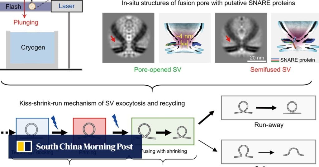 Chinese scientists have captured the “kiss-shrink-run” process of neuronal communication using the world’s first camera with nanometre resolution and a millisecond-scale imaging speed.