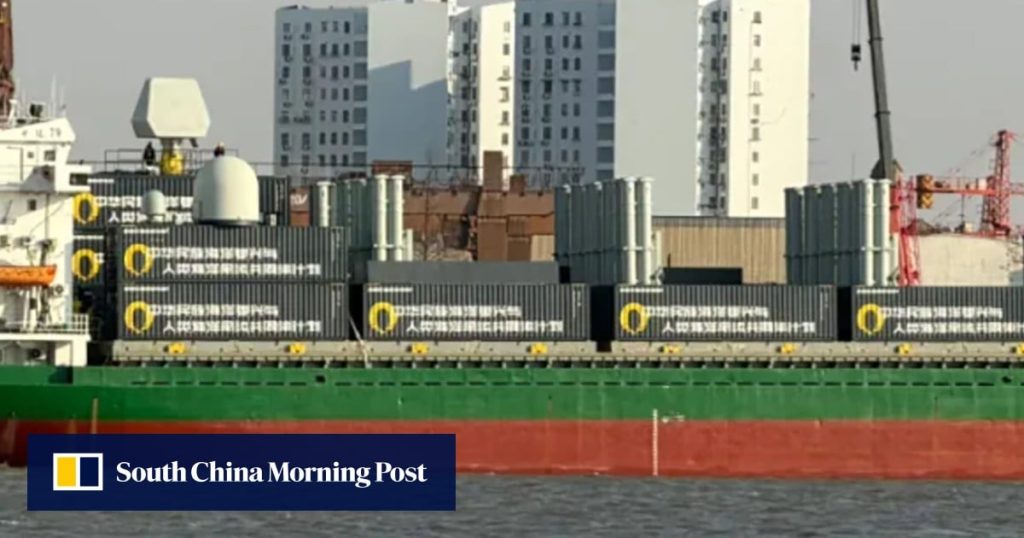 The circulated images show vertical launch systems, rotary phased-array radars, over-the-horizon radars, close-in weapon systems and decoy launchers mounted atop containers on a cargo vessel.