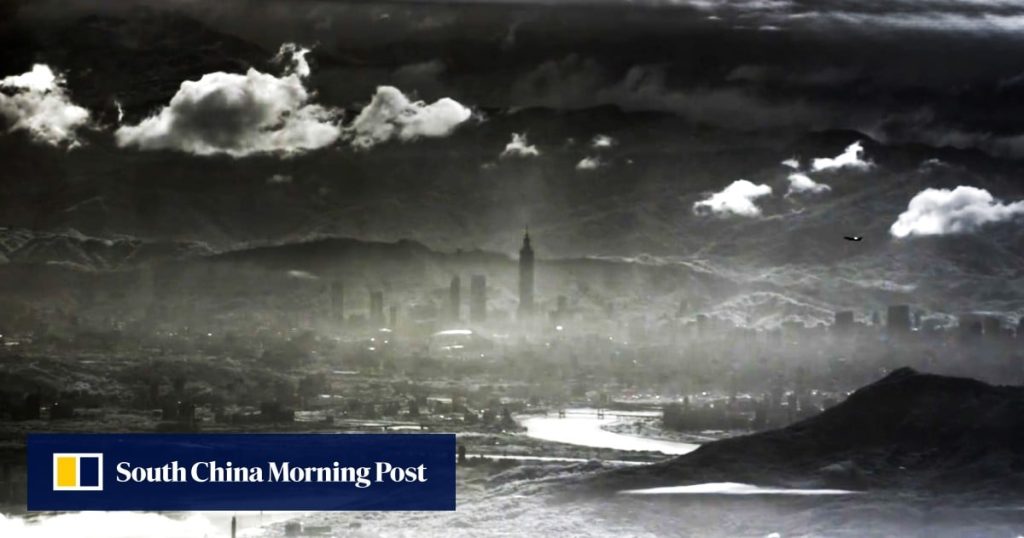 The black-and-white drone footage, released by the People’s Liberation Army (PLA) Eastern Theatre Command on Monday, shows an ascending passenger plane flying past Taipei 101, the city’s tallest skyscraper. A still image showing a panoramic view of the tower and surrounding landscape, including the Tamsui River estuary, was also featured.