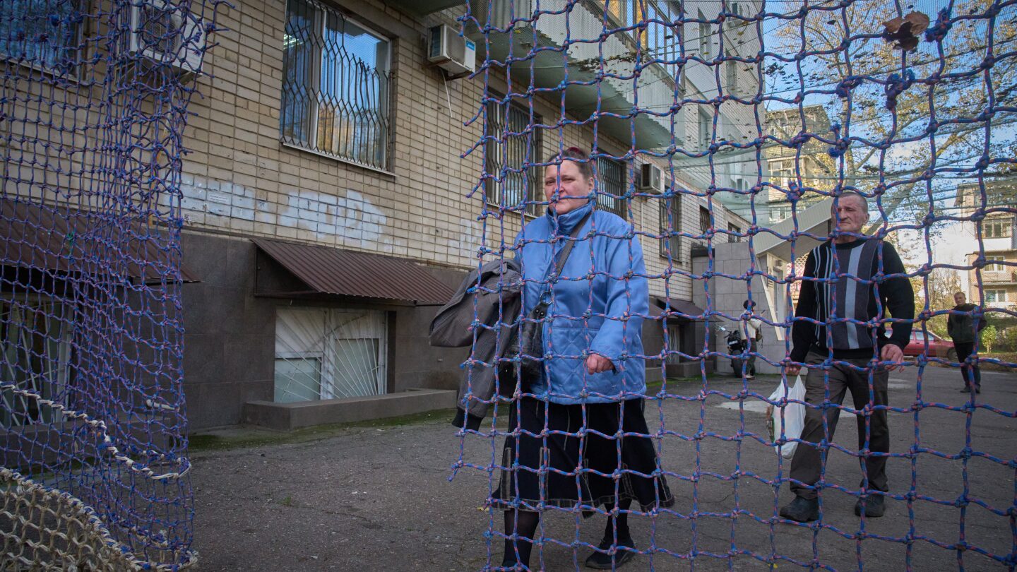 Local residents go along the street covered with an anti-FPV-drone net in the frontline city of Kherson, Southern Ukraine, Nov. 3, 2025. (AP Photo/Efrem Lukatsky)