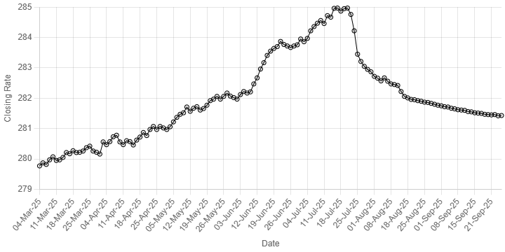 On Tuesday, the local unit closed at 281.42.