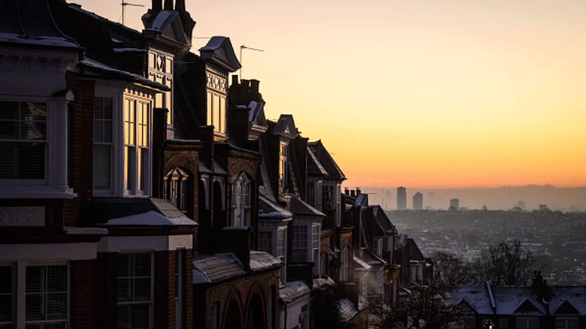 The sun rises over frost-covered houses in December 2022 in London, England. Cold weather has returned in January, causing the U.K. power supplier to offer financial incentives for households to cut use at peak times.